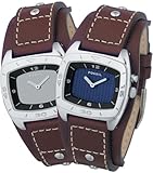 意外とごつい感じです 写真から、もっと軽い感じの、女の子でも気軽にスポーティに腕にはめられそうな印象を持っていましたが、実物は、意外とごつい感じです。ボディ背面のダブルになったベルト部分が結構、幅広で、本体は厚みがあり、重量感もあります。ボタン1つで即座に文字盤の色が変わるのは、液晶パネルを使用しているようなのですが、厚いのはそのせいかもしれません(わかりませんが)。それに革ベルトも比較的厚めです。そんな訳で、デザインの割には、全体的に大きめ、重め、何か大げさといった感じでしょうか。ベルト自体には、安っぽさはありません、茶色のベルトにステッチ縫いは美しいと思います。ボディは丸みを帯びた四角形で、ピカピカ光ったスティール製です。これも、だからといって安っぽいわけではありません。ただ、毎日はめる時計ではなさそうです。気分を変えるときには良いと思います。盤面のカラーが青/グレー(ミラーと書いてあったので、鏡面のような雰囲気を期待しましたが、やや濃い目のグレーの方が近いでしょう)のどちらかに固定できる、一定時間間隔で交互に変化する、といった機能も、気分を変えるためには良いでしょう。毎日では飽きてしまいそうです。大事なことを言い忘れていましたが、私が購入したこのタイプはレディズです。メンズにはさらに一回り大きなタイプ(こちらは秒針付)があります。一応悩んだのですが、タイトルに書いたように意外と大きくごつい感じなので、むしろこちらを購入してよかったと感じています。どちらも基本的なデザインは同じですから。全体的評価は、個人的には星4つちょっと手前の3つくらいといったところでしょうか。